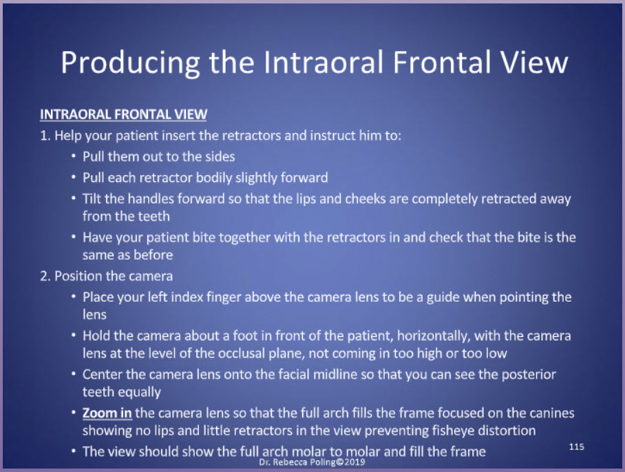 Goal- The Goal of this course is to train the individual how to recognize excellent diagnostic photographs and produce an orthodontic series of 9 photographs with excellent diagnostic quality.